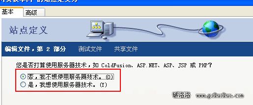 第二個是“是,我想使用服務器技術”。這個選項決定你是否使用數據庫腳本語言。關於數據庫方面的知識我們在後面一一解答,下面的例子先學習靜態站點的定義。
