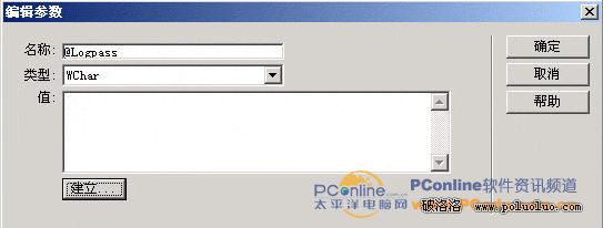 ③點擊參數“+”,彈出“編輯參數”對話框,填寫名稱為“@Logpas”,類型選擇“WChar”,如圖7-4所示。