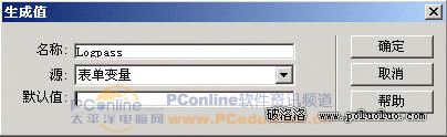 ④點擊“建立”按鈕,彈出“生成值”對話框,名稱為“Logpass”,源選擇“表單變量”,如圖7-5所示。