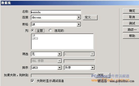 ③在彈出【數據集】對話框中,輸入數據集名稱為“menuda”,在連接下拉菜單中選擇“dkconn”,在表格的下拉菜單中選擇LM表,選擇列為“全部”選項,在排序下拉菜單中選擇字段“LMID”,設排序為升序,結果如圖4-1-5所示: