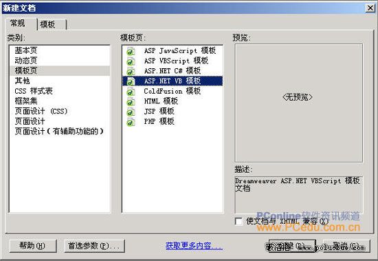 (1)打開【文件】→【新建】,打開【新文檔】的對話框,選擇“類別:”為“模板頁”,選擇“模板頁:”為“ASP.NET VB 模板”,結果如圖4-1-2所示。