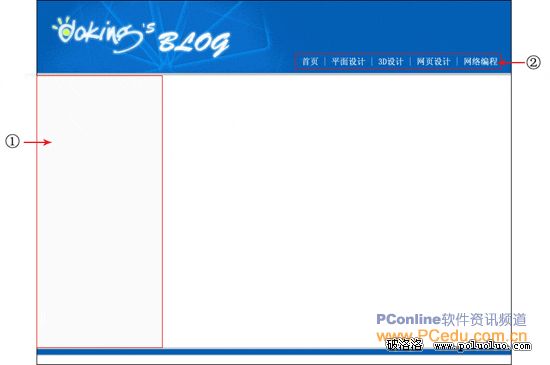 在圖4-1-1中序號①畫上紅色方圈部分的是網頁的左邊欄目,目前是空白的,它的欄目在以後章節中會一一添加上去的,序號②畫上紅色方圈部分的是網站的導航條,它是由第三章建立的dkblog.mdb數據庫中的LM表動態生成的。基本思路已清楚後,開始構建立網站的模板。