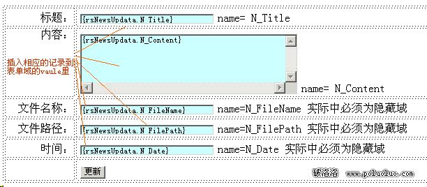 然後我們插入用來更新記錄的表單,和添加新聞的add.asp頁類似,效果如圖: