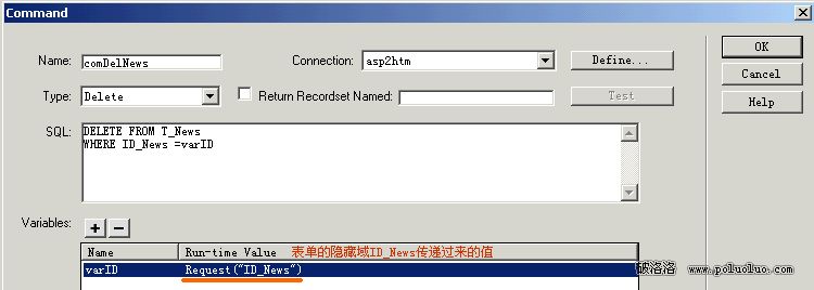 3、刪除新聞頁del.asp。在這個頁我們分別用command和FSO來刪除記錄和*.htm頁,打開空白的del.asp頁,打開Date Bindings --> Command(Stored Procedure) ,新建一個command命令,如圖: