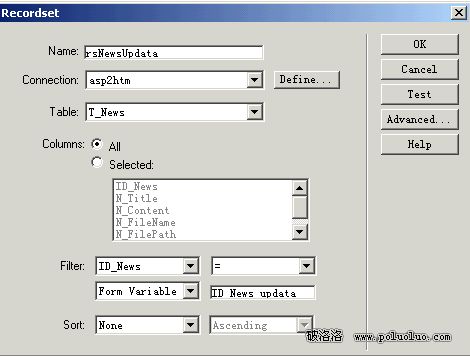 5、updata.asp頁面。這裡我們先建立一個記錄集,如圖: