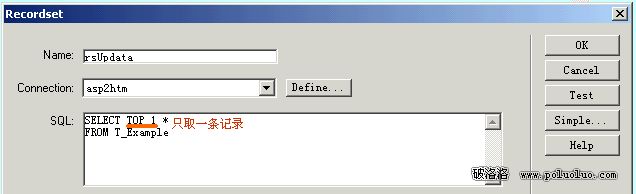 1、模板的修改。我們先從簡單的模板修改入手,這個原理很簡單:把模板的數據記錄取出來,使用Updata Record,就行了。我們在example_updata.asp頁上放一個表單及一個text域(多行),建立一個記錄集,如下圖: