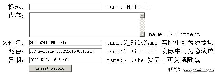 1、頁面清單。在這個簡單的新聞系統中,我們要用到如下頁面:add.asp(添加新聞),browse.asp(新聞浏覽),del.asp(刪除新聞),example_updata.asp(模板修改), save.asp(保存新聞),ok.htm(成功頁) ,updata.asp(修改新聞),updata_save.asp(保存修改)