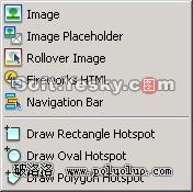 首先需要將Fireworks HTML文件導出到已定義的Dreamweaver站點中,將光標放在文檔中要插入的位置。選擇“Insert” -> “Image Objects”->“Fireworks HTML”或者在插入面板的“Common”類別中單擊插入圖像按鈕旁邊的倒三角形,這時會彈出圖8所示的下拉菜單。