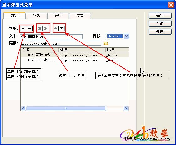 6.在“顯示彈出式菜單”中添加彈出菜單,並做外觀和位置的設置。中文版一看就明白,這裡不多說了。