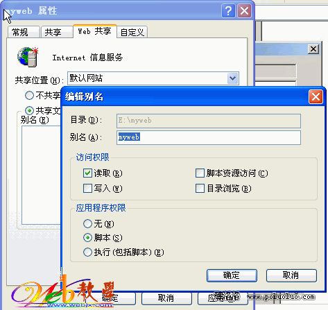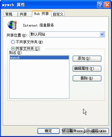 3、出現屬性對話框後,選擇“Web共享”標簽,點選“共享文件夾”,出現共享別名對話框,選擇默然設置,確定即可。