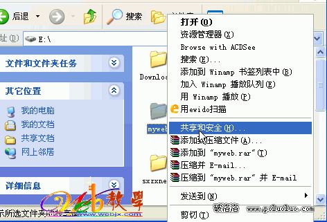 2、回到myweb的根目錄,右鍵選擇“共享和安全”(其實是快速地建立虛擬目錄)