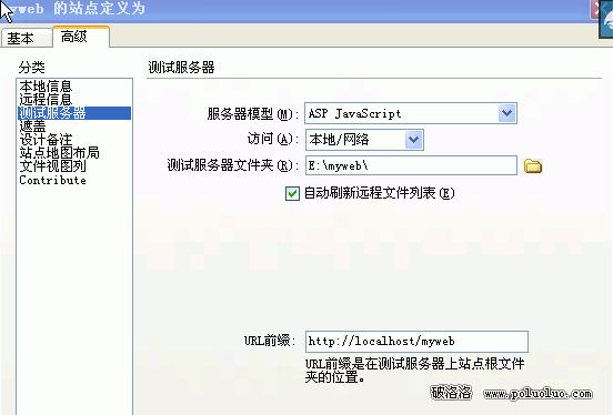 8、再接著“測試服務器”,“服務器模型”暫為ASP javascript,“訪問”本地/網絡,“測試服務器文件夾”仍是我們的站點文件夾e:\myweb\,“URL前綴”在http://localhost後面加入myweb,添加的東西就是我們步驟3中設置的虛擬目錄