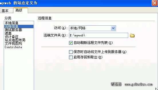 7、然後設置遠程信息,訪問選擇“本地/網絡”,遠端文件夾仍選擇我們的站點文件夾e:\myweb\