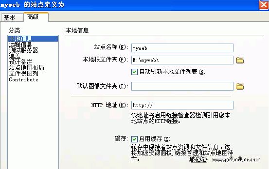6、選擇“定義站點”,在彈出的屬性框中選“高級”標簽,從“分類”中先選“本地信息”,右窗口中設置站點名稱(隨便輸入,但自己要清楚其代表的意思,推薦和你站點的根文件名同),本地根文件夾(這時候就指向到我們在步驟1中建的文件夾了)。