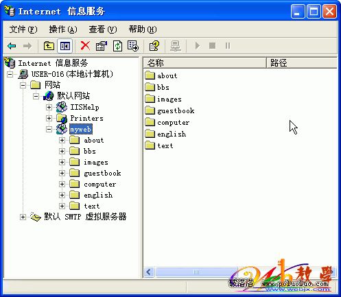 4、補充說明。其實設置Web共享就是設置IIS的虛擬目錄。你可以查看到IIS中默認網站中已經有了myweb(附注:偶的OS是winXP的,其實有關IIS的操作一回事。如: winXP裡面打開控制面板-管理工具-Internet 信息服務---本地計算機---默認站點)(注:關於在XP下安裝IIS的方法請看:XP下安裝IIS5.1視頻教程)
