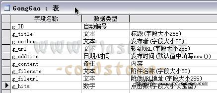 這個系統比較簡單,所以數據庫的設計也相對簡單,按照下面圖中的說明進行設計就行了,需要注意的一點就是在g_addtime字段的默認值中需要填上now()。數據表名:GongGao: