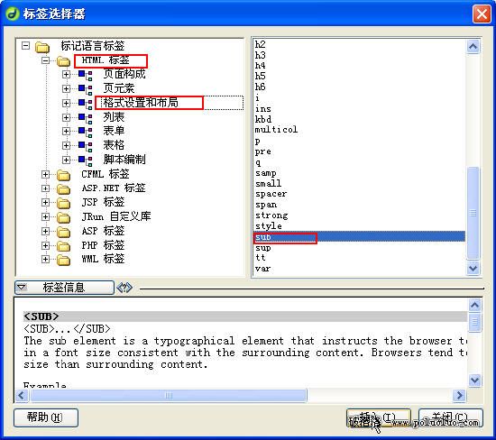 按照輸入上標的方法,在“標簽選擇器”中選擇sub標簽,單擊“插入”按鈕。