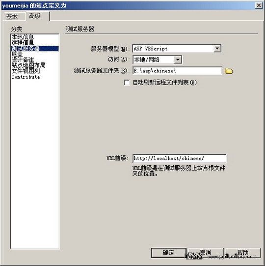 2)為該站點指定的測試服務器沒有映射到http://localhost/_mmserverscripts/MMHTTPDB.aspURL.請確認url前綴映射到了您站點的根上.”但是此 時IIS服務器是運行正常。出現此問題的原因是站點的測試根目錄使用了localhost,只要改為其他任何地 方都行。但是要注意在Dreamweaver和IIS中使用相同的設置(此處假設為chinese),則Dreamweaver測試 服務器URL前綴使用http://localhost/chinese/。IIS設置的時候使用別名用剛才的chinese,其他均按照 平常的設置。此時,你會發現在Dreamweaver中可以使用F12預覽網頁。再使用自定義連接字符串就成功了 。