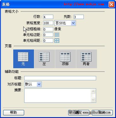 Step 1 在Dreamweaver的設計視圖中插入一個4行3列的表格。