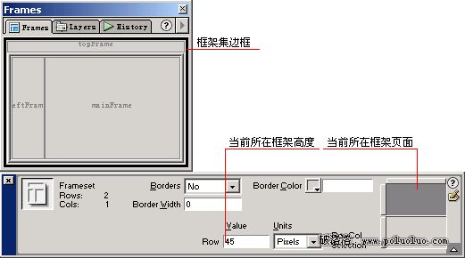 5、改變框架集頁面大小。在框架面板中選定上下框架集邊框,設定頂端框架頁面的高度,如圖九所示;