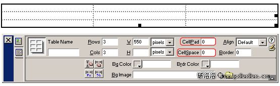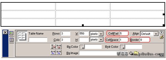2、在屬性面板中定義表格的Border為0,CellPad為5(這項可使單元格中的內容與單元格邊緣之間保持5個像素);CellSpace為1(此項使得單元格之間保持1個項素的間距)。如圖三;