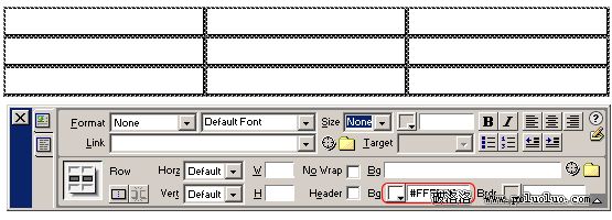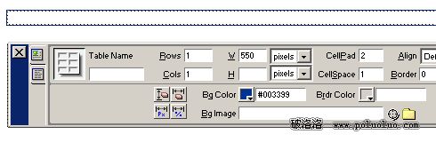 1、使用Object面板插入一個表格,定義表格寬、高及行數和列數。注意此時Dreamweaver中插入表格的默認CellPad和CellSpace、Border都為0。如圖二;