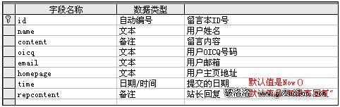 ·日期/時間的“常歸”項中默認值為Now();站長回復裡的“常歸”項中的默認值為“暫沒有回復”,注意此處要加雙引號,是半角而不是全角。