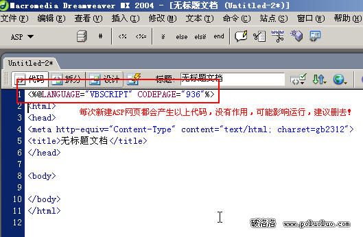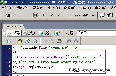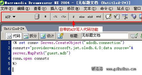 這次主要是寫連接數據庫和參數設置的ASP代碼,不用輸出什麼HTML標簽,所以把代碼全部刪掉,用DREAWMEAVER插入欄自帶的ASP對象寫入以下代碼,ASP欄裡沒有的代碼只能自己手寫輸入了。