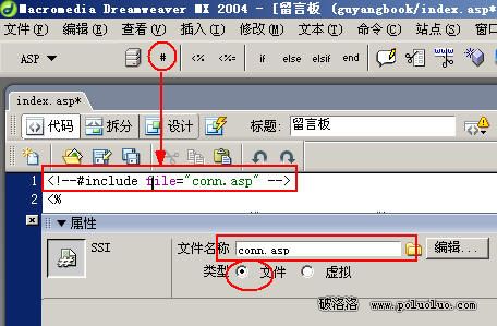 在網頁代碼的最上面第一行,點擊用紅線圈起來的標志可以插入第一行的代碼,並可以浏覽到具體文件上,比較方便,注意選擇file文件類型的,不是virtual虛擬類型的。這樣就插入了conn.asp數據庫連接代碼頁,此代碼被包含在當前網頁位置中進行正常編譯,不用重復寫數據庫連接代碼,它的好處很大哦,使頁面結構化,容易修改和維護,如果數據庫連接錯誤,或數據庫文件變動,只需更改conn.asp即可,不必要修改每一頁的代碼。要善於用這個方法啊,會使你的程序簡單化,清晰化,這是常用的編程方法。