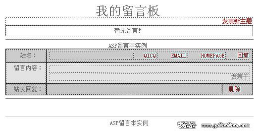 初學者在學ASP的時候往往是無從學起,學理論的時候又太抽象不好懂,實踐的時候又找不到合適的例子來分析練習,有時候找到一個源程序學習的時候,功能太繁雜,涉及到的ASP模塊太多,也附帶了不少的函數,這樣使初學者一頭霧水,知難而退,實際上ASP是比較容易掌握的,今天就是為了這個目的,剝繭抽絲做了一個非常簡單的留言板,只有留言,刪除和回復的功能,沒有管理權限功能(站長登錄,修改密碼等)、判斷功能(表單驗證等)及分頁功能,簡潔干煉,主要是為了初學者掌握最重要的知識,就是如何抓取數據庫以及如何查看、刪除、修改記錄的操作,我們先從這個超級簡單的留言板開刀吧,此關只要能過,恭喜您了,將來即可步入ASP應用的行列了!:)本教程完成後會提供下載!