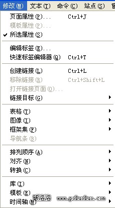 “修改”菜單 使您可以更改選定頁面元素或項的屬性。使用此菜單,您可以編輯標簽屬性,更改表格和表格元素,並且為庫項和模板執行不同的操作。