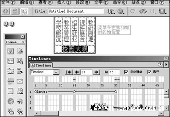 1、選定層面,當鼠標變成“十”字形時按住左鍵將層面拖動到頁面右上角(使整個菜單條完全露出但上邊緣正好靠攏頁面上邊界),在窗口菜單中打開時間線面板,選定層面將其拖動到時間線上,Dreamweaer會自動產生一個長度為15幀的動畫對象,拖動該動畫對象的最後一個關鍵幀到第30幀,將其長度設置為30幀。然後在第15幀處單擊右鍵,在彈出的快捷菜單中選擇“添加關鍵幀”選項插入一個關鍵幀,並將層面拖動到適當位置(如圖2)。在時間線窗口中的第15幀處再次單擊右鍵,在彈出的快捷菜單中選擇“添加動作”,為該幀添加一個交互行為,Dreamweaer將自動打開行為面板。單擊行為面板中的“+”按鈕,從彈出的菜單中選擇“Timeline/Stop Timeline”,打開“Stop Timeline”對話框,選擇“Timeline1”後單擊“確定”按鈕關閉該對話框。交互行為的事件為“onFrame15”,動作為“Stop Timeline”,這樣當時間線運行到第15幀時,動畫將停止播放,這樣就實現了菜單條彈回的功能。