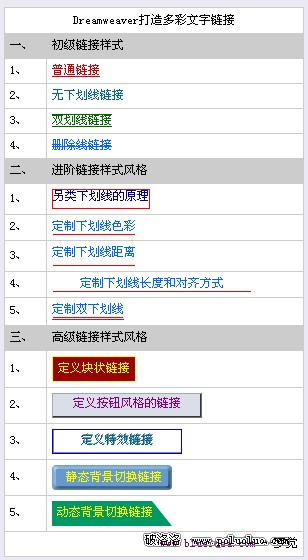 DIV+CSS佈局教程網 >> 網頁製作工具 >> Dreamweaver教程 >> Dreamweaver相關 >> DW網頁設計教程-多彩文字鏈接