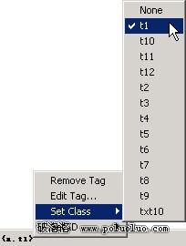 5、 為鏈接文字添加樣式類。在Dreamweaver中選擇一項鏈接文字,在窗口最下端的快速標簽選擇條上選擇標簽,右鍵點擊此標簽,選擇Set Class將自定義的樣式賦予此鏈接文字即可,如圖;