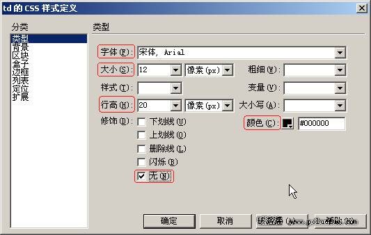 行高:行高是一行文字與另一行文字之間的距離,為了方便閱讀,行高設置大點吧。可以設置在15像素到25像素之間。實例中使用20像素。