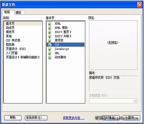 在"新建文檔"對話框中的"類別"列中選擇"基本頁",在"基本頁"列中選擇"CSS",然後單擊"創建"。