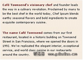 當您將樣式表附加到 Web 頁面中時,在樣式表中定義的規則將應用到頁面上的相應元素。例如,當您將 cafe_townsend.css 樣式表附加到 index.html 頁時,將根據您定義的 CSS 規則設置所有段落文本(用 HTML 代碼中的標簽設置格式的文本)的格式。