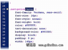 當用戶把鼠標指針停留在已設置格式的頁面元素上時,:hover 偽類會影響該元素的變化。例如,將 :hover 偽類添加到 .navigation 類樣式 (.navigation:hover) 以創建新規則時,根據 .navigation:hover 規則的屬性,所有用 .navigation 規則設置格式的文本元素都會發生變化。