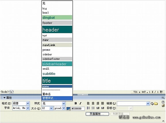 使用文本屬性檢查器可以設置當前所選文本的格式。使用屬性檢查器設置文本格式時,Dreamweaver 將跟蹤您為每個文本元素指定的格式設置屬性,並使用命名約定為每個元素指定一個標簽:Style1、Style2、Style3、Stylen。如果為兩個或更多文本元素指定相同的格式屬性,Dreamweaver 將使用相同的標題標記這些元素,減少了不必要的樣式名稱。Dreamweaver 應用到一段給定文本正文的標簽稍後即可使用"樣式"彈出式菜單進行應用,使您可以在頁面內生成一個樣式庫,然後只需選擇頁面中的文本元素,從"樣式"彈出式菜單中選擇一個樣式,即可應用這些相同的樣式。您可以使用更具有意義的標簽重命名這些樣式,例如 Heading1、Heading2、Body 和 TableBody。