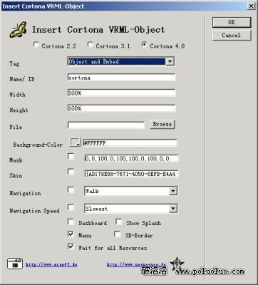 前言:眾所周知,我們生成的VRML作品有時需要插入指定的網頁中。在沒有指定的浏覽的情況下,我們可以用EMBED在HTML中通過手工編輯源代碼來直接鏈接引用VRML文件。不過我們知道,目前由於沒有一個壟斷的專業浏覽器,並且各家