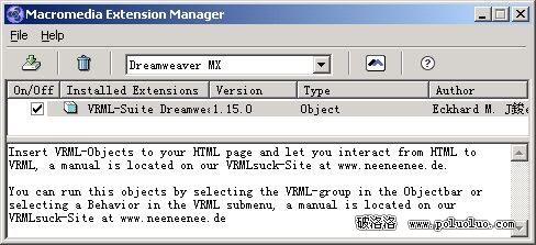 點擊安裝vrmlsuite115的mxp文件後,在Macromedia Extension Manager中我們可以看到如下的文件信息。