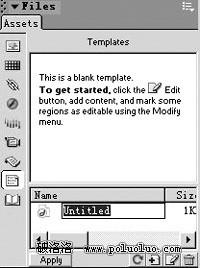 2、找到“Assert”子選項,在左邊的工具欄中單擊“Templates”按鈕,此時的模板為空,我們可以在右下角單擊“New Template”按鈕,一個空白的模板就會出現在面板中(如圖1),點擊模板名稱,是模板進入可編輯狀態。注意,此時的模板還沒有任何添加任何元素,我們可以像編輯普通網頁一樣在模板上添加表格、圖像、文字等。添加完後,保存模板,可以在默認站點文件夾的“Templates”子文件夾下找到剛才做好的模板,擴展名為.dwt。