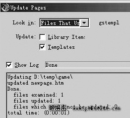 打開“Templates”子選項,雙擊關聯網頁的模板,這時候模板進入了可編輯狀態,黃色區域消失,改變了模板的內容後,保存時就會出現一個提示對話框:“下列網頁使用了當前模板,是否進行更新?”(如圖2)單擊“Update”,此時,網站中所有基於模板創建的關聯網頁都將得到更新(如圖3)。