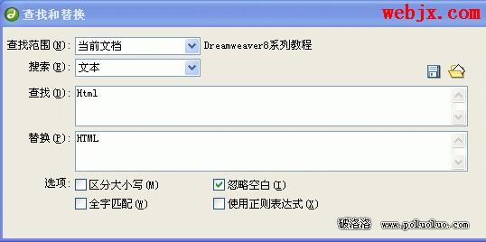 例如,我們可以把所有網頁文檔中的“dreamweaver” 都改為“Dreamweaver8” ,也可以把文檔中所有的半角的逗號“,”改為全角的逗號“,”等等。