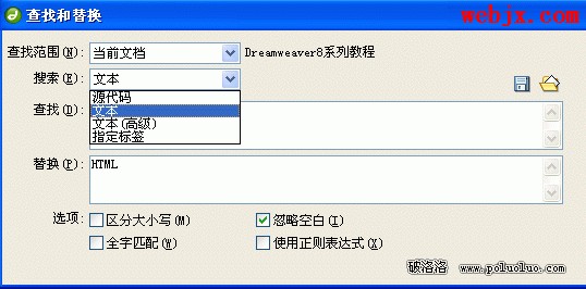 下面的“搜索”項用來選擇查找的類型,如下圖。有4項,第一項是是指查找類型為HTML代碼,第二項是文本,指非HTML代碼,第三項是文本(高級),點選此項,下面會出現進一步選擇的對話框,第四項是指查找類型為指定標簽。