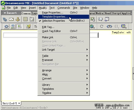 (1)用上面創建的模板新建一個網頁,選擇Modify>Template Properties(修改>模板屬性)。