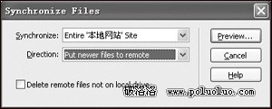 在輔助面板運行“Site→Synchronize”命令,此時可以看見(圖3)所示的對話框。首先在“Synchroniz”下拉菜單中選擇整個網站還是選中的文件,接著從“Direction”下拉列表中選擇“Put newer files to romote”一項,這樣可以由Dreamweaver MX 2004自動尋找本地文件夾中更新過的文件上傳到遠程服務器中。