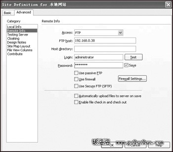 進制在窗口左部選取“Remote Info”一項,接著在右部區域中輸入申請空間的時候得到的遠程FTP站點傳輸類型(一般為FTP)、遠程服務器存放文件路徑、主機地址、用戶名和口令等信息。同時還要根據站點的傳輸模式來選擇是否采用“Use passive FTP”一項,這是因為部分FTP站點采用被動工作模式,對於這部分站點就要選取該項(如圖1)。