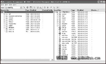 確認之後,Dreamweaver MX 2004將自動出現站點輔助面板,在此先點擊“連接”按鈕建立與遠程站的連接,接著按下輔助面板最右部的“Expand/Collapse”按鈕,這時即可將輔助面板擴展顯示(如圖2)。在默認情況下,左邊窗口顯示的是遠程站點中的文件,右邊窗口則是本地硬盤中的文件。