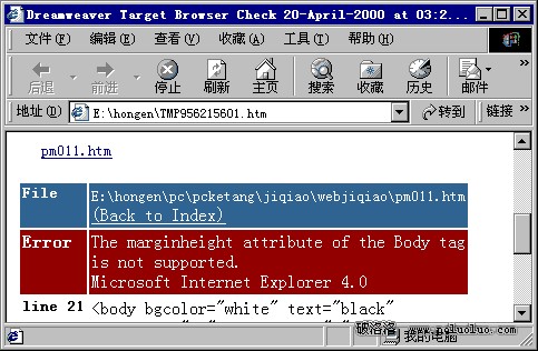 我們一般選擇“IE 4.0”和“Netscape4.0”檢查即可,如果檢查結果發現有浏覽器不支持的地方,我們在測試結果窗口中能夠看到是哪個語句有問題,我們只須做相應的修改即可。